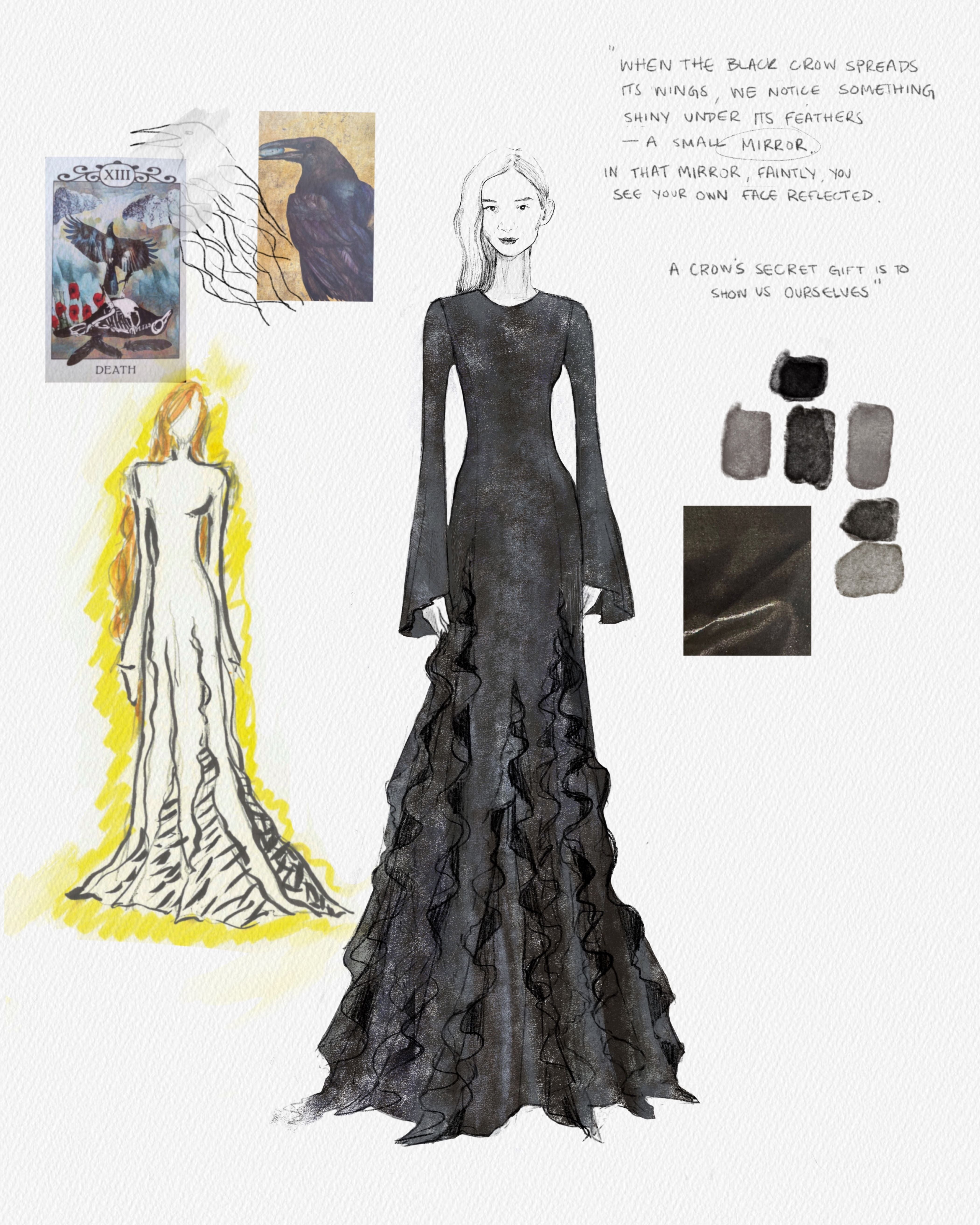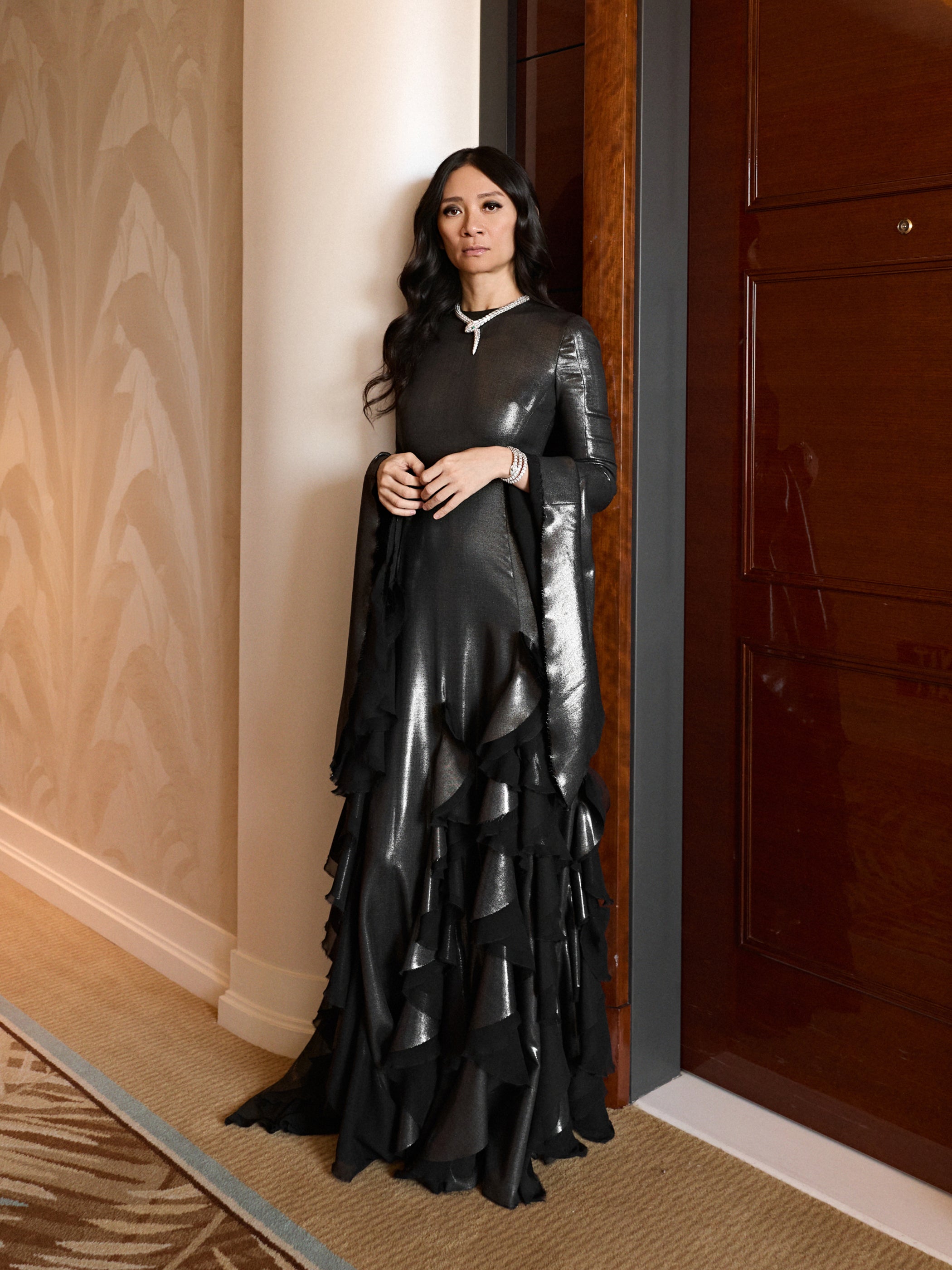 Chloé Zhao wears a custom iridescent silver and black dress in repurposed wool gauze, dyed black coated in silver metal leaf, representing the crow, with silk georgette combo degradé spiral ruffles godet details.